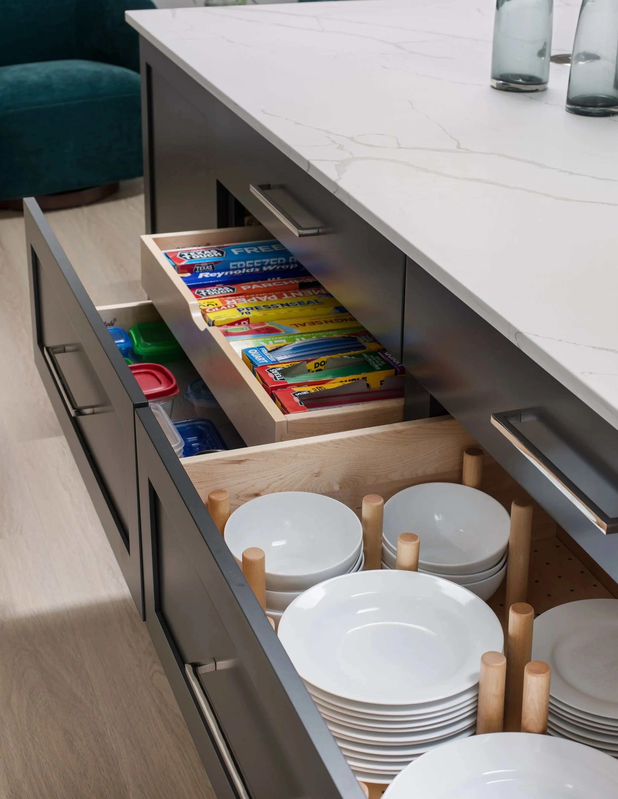 This stunning kitchen remodel transformed a nearly 50-year-old home into a modern, open-plan space. Working closely with the homeowners, we reconfigured the dining room, kitchen, and breakfast nook to create a more spacious layout, featuring a large island and wider walkways for improved flow. The Brookhaven by Wood-Mode cabinetry perfectly balanced the homeowners' desire for a light, airy atmosphere while avoiding traditional white cabinets. We used Warm Gray for the perimeter and Iron Gray for the island, adding a modern yet stately touch. Thoughtful attention to cohesive colors, textures, and materials, including the striking contrast between the iron-gray island and Cinder sink, ensures a unified, visually appealing design. The result is a beautifully functional space that reflects the homeowners’ vision, with expert guidance at every step.